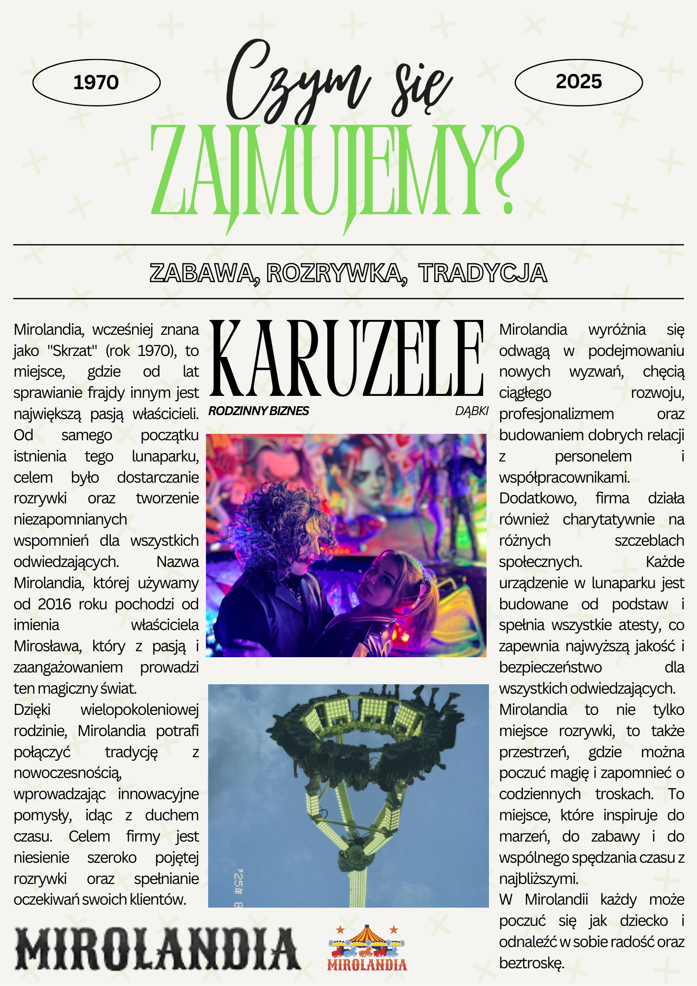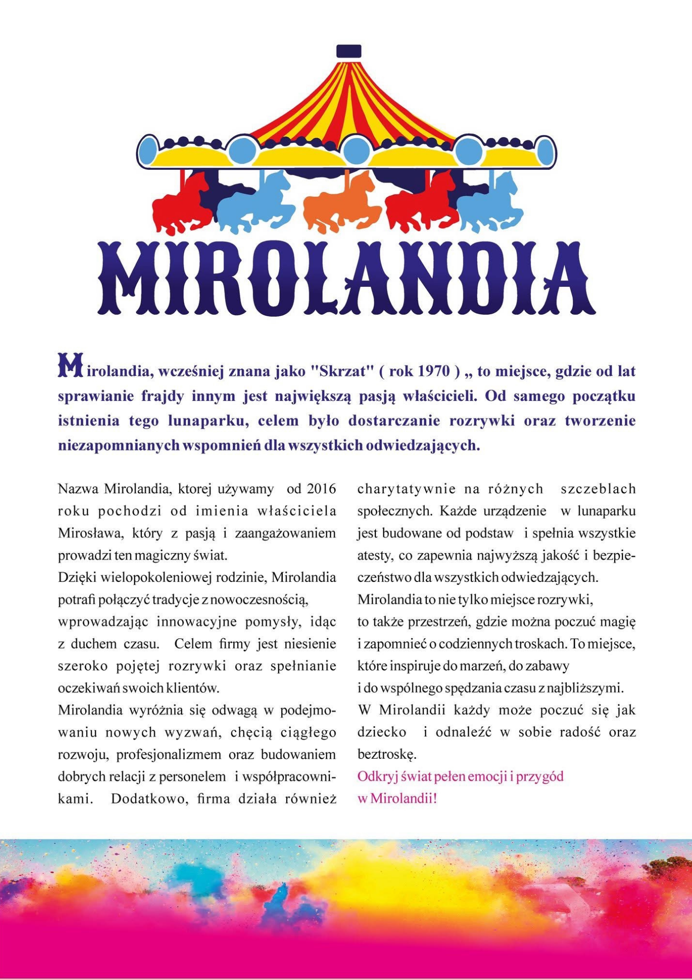 Mirolandia, wcześniej znana jako "Skrzat", to miejsce, gdzie od lat sprawianie frajdy innym jest największą pasją właścicieli. Od samego początku istnienia tego lunaparku, celem było dostarczanie rozrywki oraz tworzenie niezapomnianych wspomnień dla wszystkich odwiedzających.